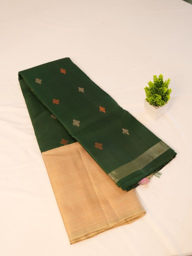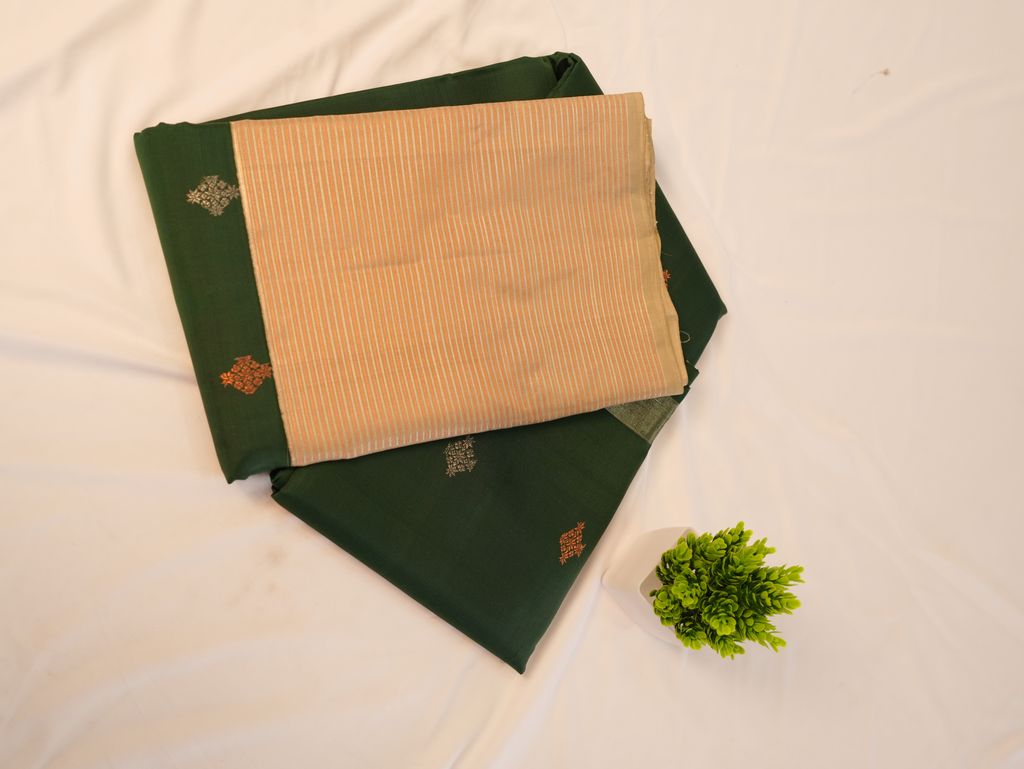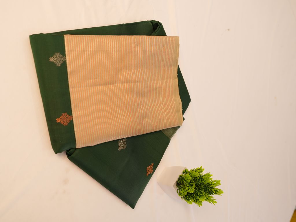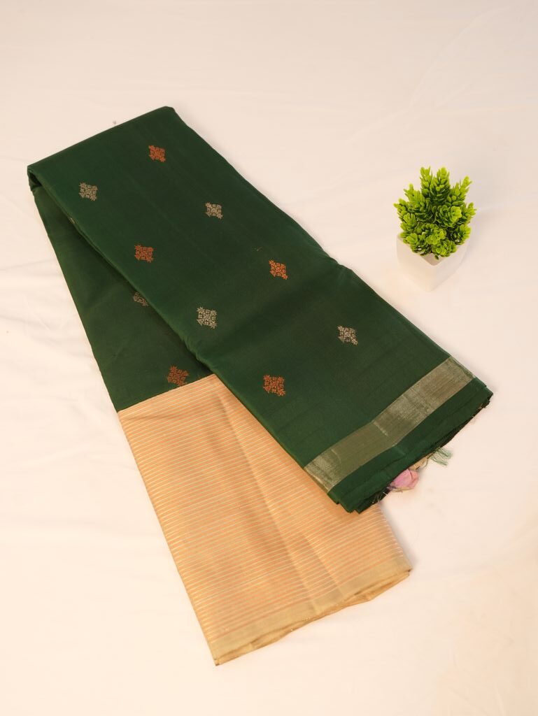 A bottle green Gadwal Kanchipuram silk saree with elegant zari butta and contrast pallu. Smooth silk texture and rich festive look make it perfect for weddings, festivals, and cultural functions.