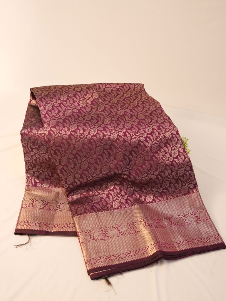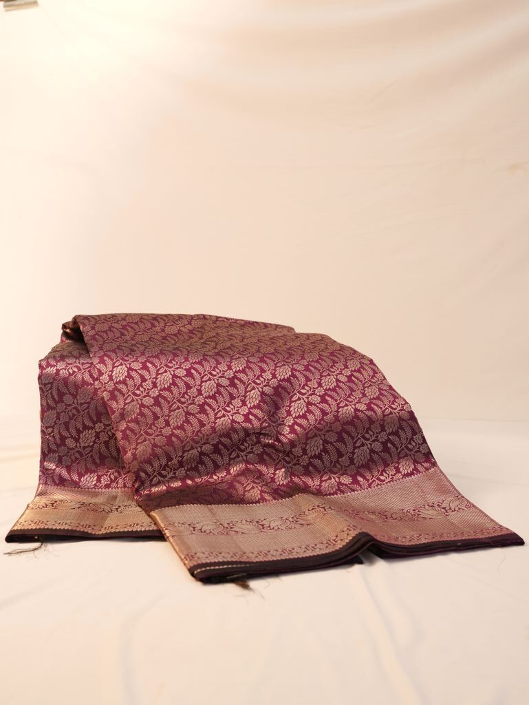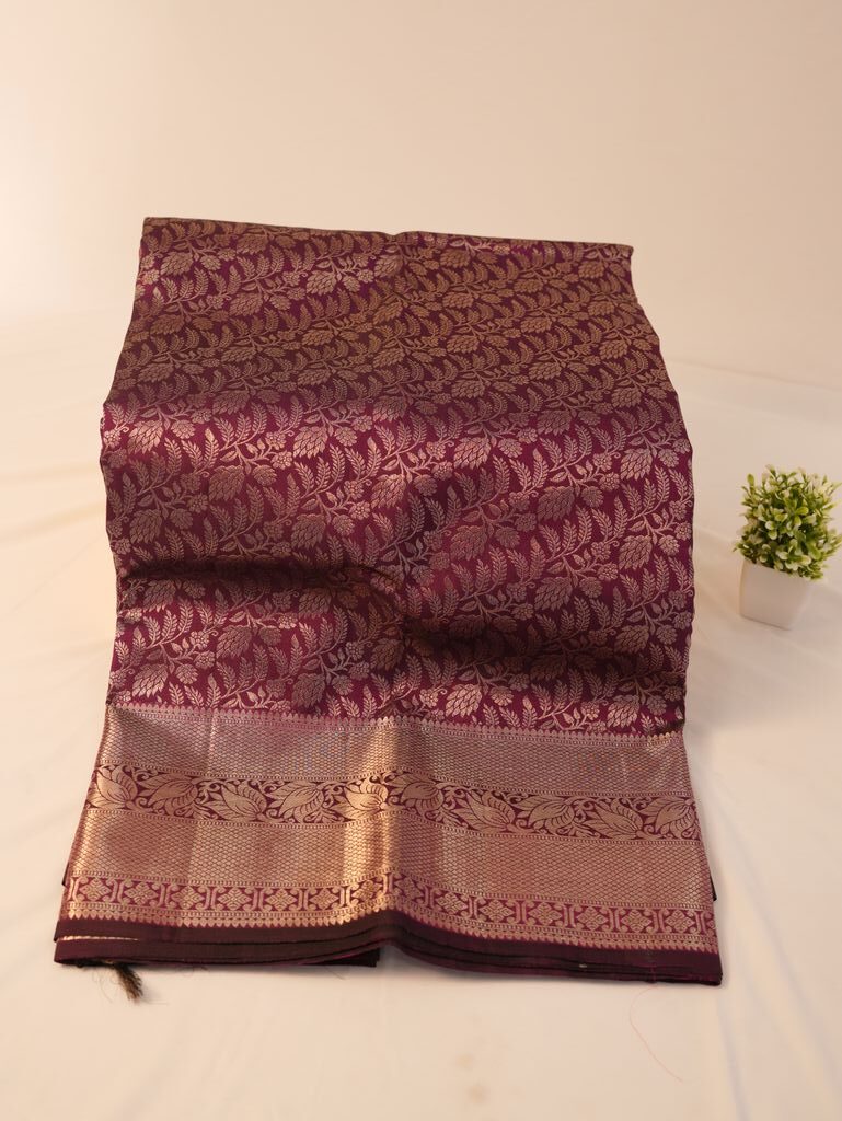 The Gold Zari Floral Bridal Saree has gold thread making flower designs on border pallu looking so pretty beautiful type. Wine color going best with heavy gold jewelry what makes whole look very grand. You keeping this saree long years, wearing many times for marriage festival all functions, quality not spoiling staying strong always.