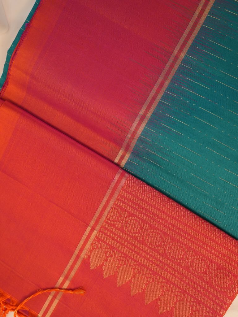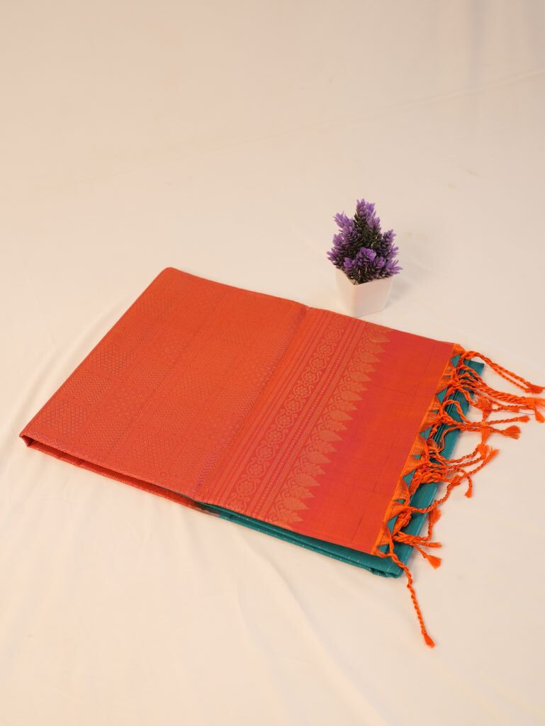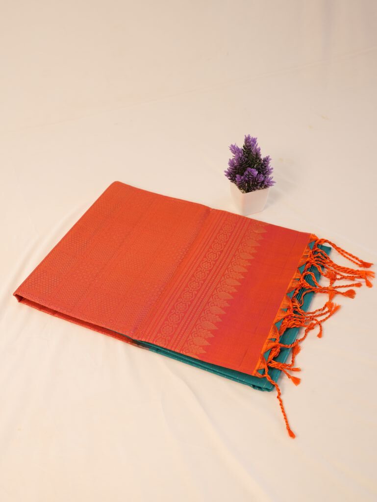 The colors are bright and attractive, like orange and turquoise silk saree shades, and the designs are classic and simple. This saree suits brides, wedding guests, and festive days very well. It brings tradition, beauty, and luxury together and is a good choice for Kanchipuram saree online shopping India.