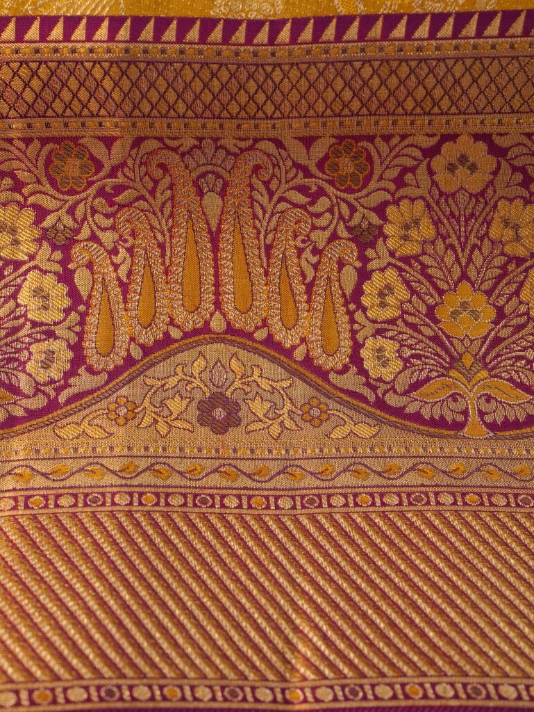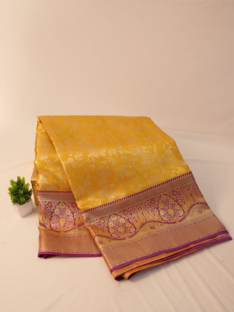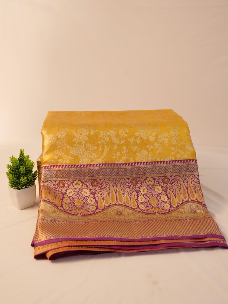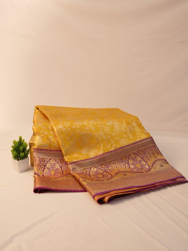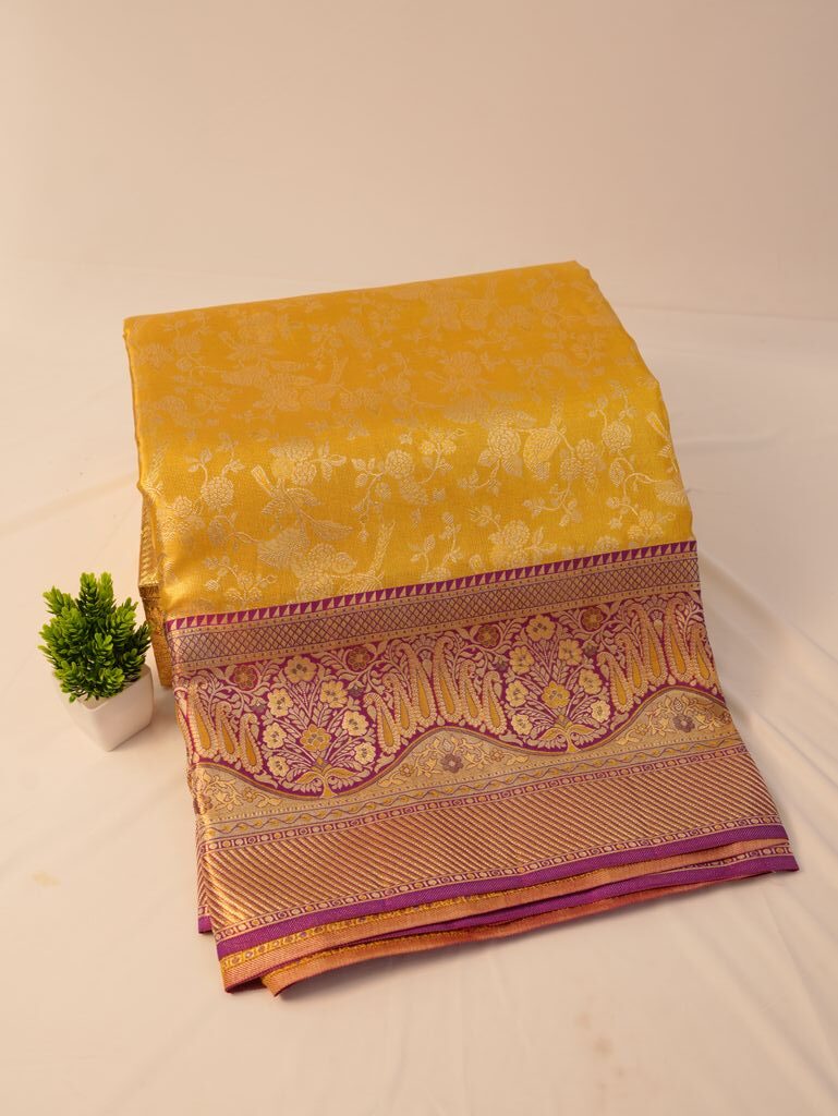A purple zari border adds a royal contrast to the yellow silk body. This colour combination improves visual balance and gives the saree a rich, elegant appearance.